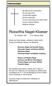 Roswitha Nagel-Kloeser (* 26. octubre 1936 / † 24. febrero 2026)